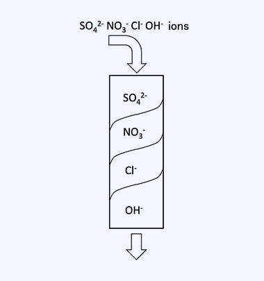 For example, when water containing SO42- and Cl- ions is passed through an OH-type anion exchange resin, an adsorption zone for SO42-, which is most easily adsorbed, forms at the top of the resin layer, followed by an adsorption zone for Cl-, and at the bottom, there remains OH-type resin that does not participate in ion exchange. Utilizing this property allows the ions present in the water to be adsorbed. In addition, for water treatment, the adsorption of mineral acids can be achieved with either strong or weak base anion exchange resins, but the removal of silicate (silica), which may be present as a target contaminant, is only possible with strong base anion exchange resins.